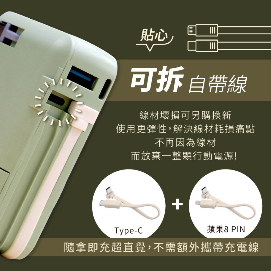 - Type-C+蘋果雙線設計,隨拿即充,不需額外帶線。