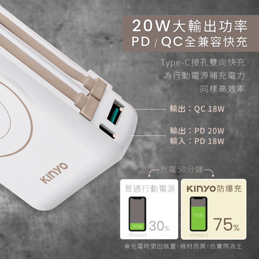- PD/QC全兼容快充,最高支援PD 20W及QC 18W。