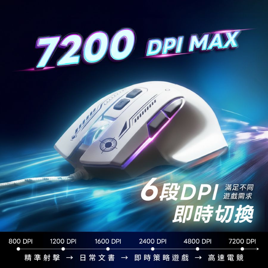 - 六段DPI即時切換-800/1200/1600/2400/4800/7200 DPI,滿足不同遊戲的靈敏度需求