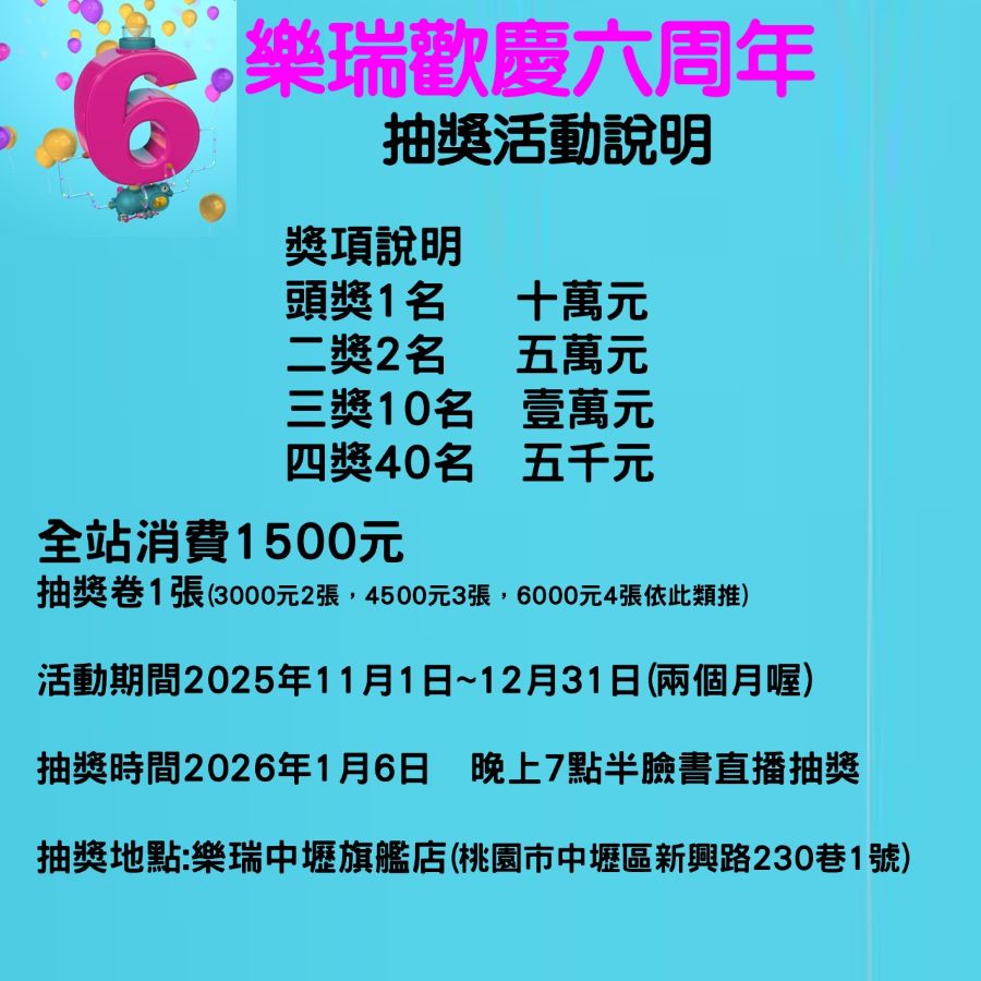 樂瑞購物滿6周年了,單筆訂單消費滿1500元一張抽獎卷,3000元2張,依此類推,最大獎現金十萬元。