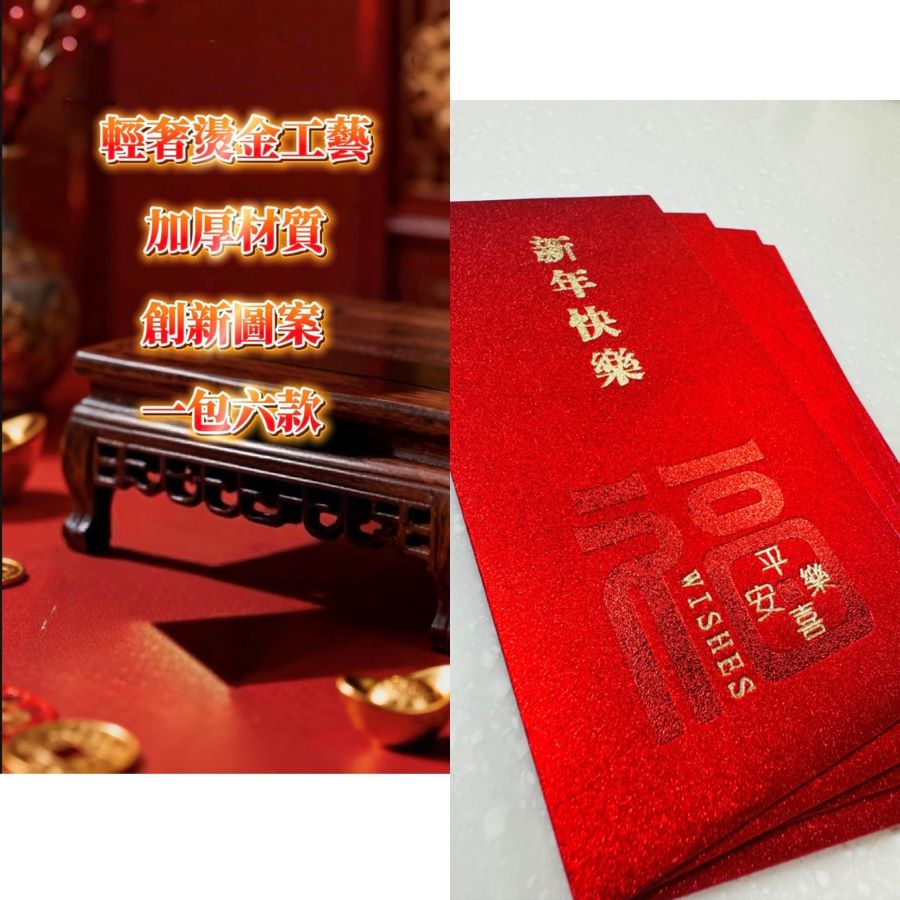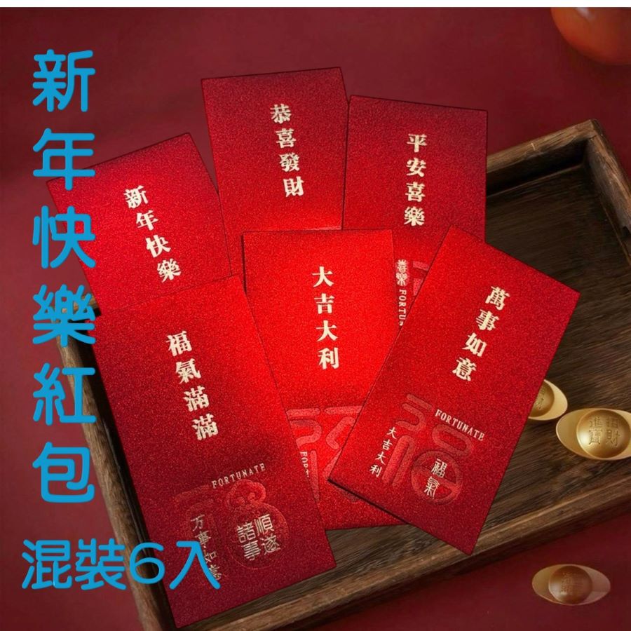 6個不同設計的紅包混裝,大紅底,點綴亮閃閃金粉,祝樂瑞會員新年快樂。